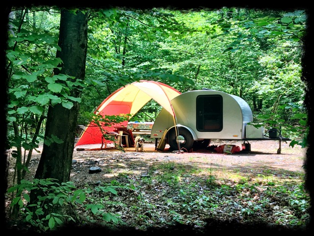 When we are expecting rain, we go ahead and set up the Big Agnes Three Forks Shelter to cover the back end of the trailer.