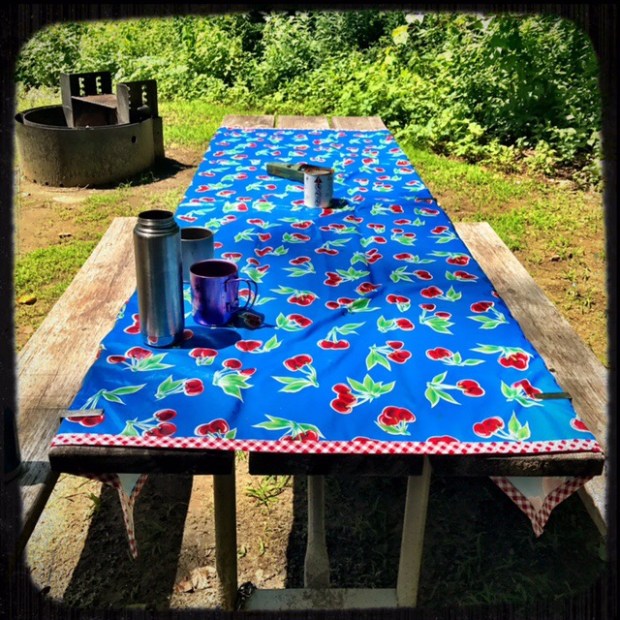 There is one necessity that any “civilized” camper knows- you need a tablecloth. Sure, sitting at an uncovered, possibly dirty table is okay if you are at an impromptu picnic in the park or if you are a through camper carrying everything in a pack on your back. But if you are bringing any gear at all, a tablecloth must be amongst what you have in your stash. Tables are often covered with grime or at least forest detritus and the easiest way to ensure that it doesn’t mar your mealtime is to cover it up.