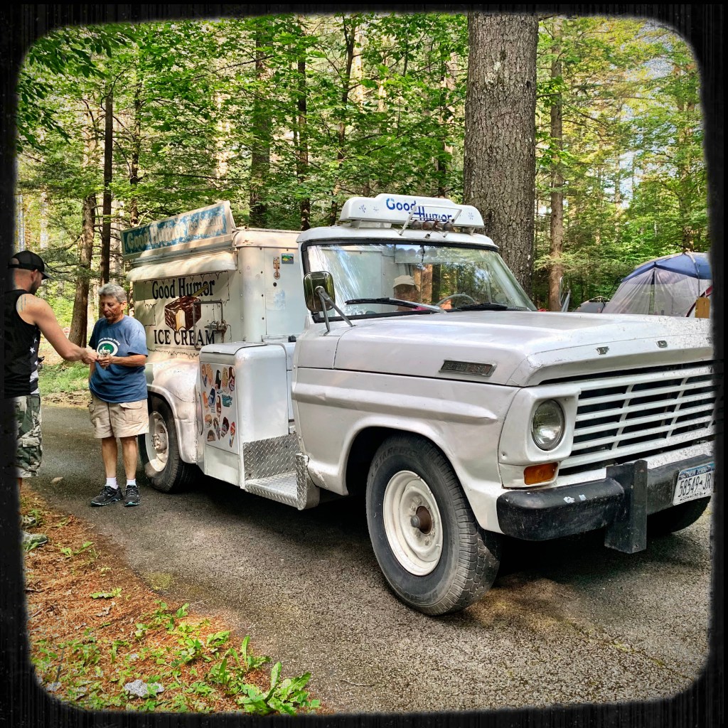 This isn’t a phenomena I have seen everywhere. But when you are camping in the Catskills or the Adirondacks, occasionally you’ll be sitting at camp and hear a song. And no, it’s not a camp song or a bunch of girlscouts (though you might also hear those). It doesn’t sound the way it might in a city. But there is a bell or a clanging and a little song and it is clearly moving along the road and sometimes at a crawl and others a clip. When you hear it you have to quickly decide “do I want ice cream?” “now?.” Because if you do, you better pick up your wallet and run to the road and chase down the ice cream truck.