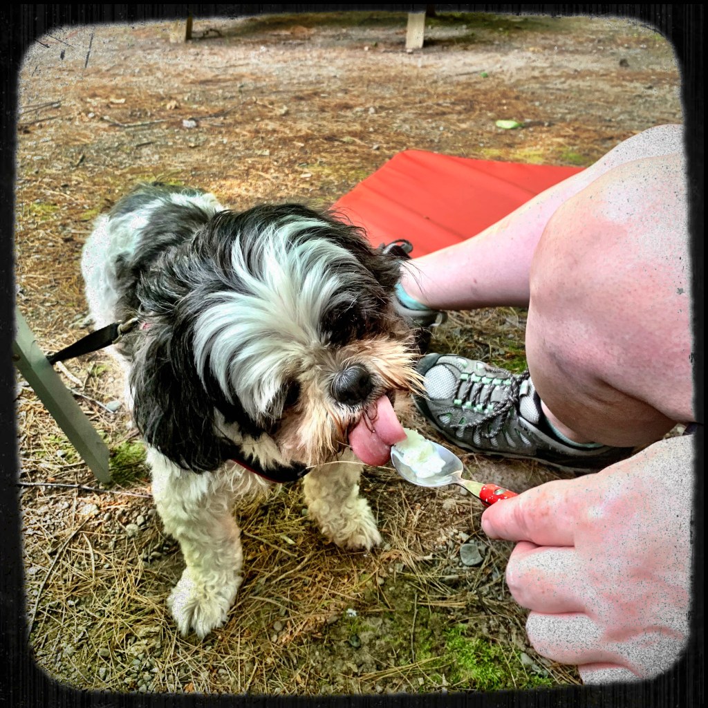 Sometimes the dog hears the truck first (they like ice cream too!). And you have to grab some cash and throw it at your husband and tell him “RUN!” He loves you enough to run from one loop to the next to the next chasing the truck and then waiting in line before sauntering back into camp with two ice cream bars. You gratefully open yours and grab a spoon and a paper towel so you can share some bites with the dog. Because he’s not going to stop staring at you with that toothy grin until he gets to share in the fun!