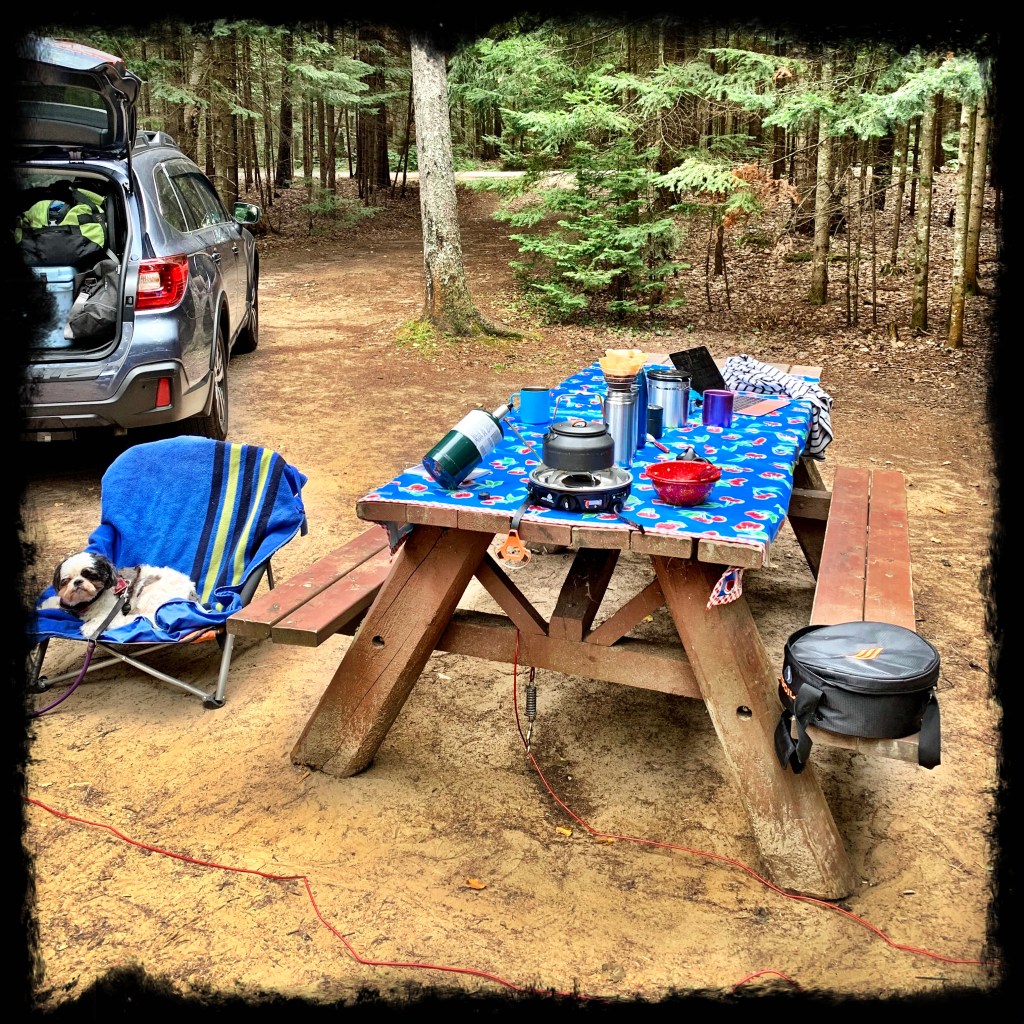 As we drove past the other camps last night headed to get some ice at the general store, we talked about everyone who had prepped for rain by having some sort of tent or easy-up over their picnic table. We had prepped for rain by putting the Big Agnes over the back of the camper, but hadn’t brought our second rainshield that could cover the table. We didn’t even think about it. We realized that we hadn’t been on a long trip where we had included this item in a while. We got through the rain on our travels last summer without really needing it, but hadn’t even thought to include it for this trip. I guess we’ve gotten so good at settling behind the trailer in our chairs when it rains that it doesn’t bother us much. But then there is always the day after the rain when it is easy enough to wipe down the picnic table cover, but the benches are still wet and we end up having to cover them with our spare towels. Hmmppff. We might want to put that extra rain shield back on the list for long or rainy trips.
