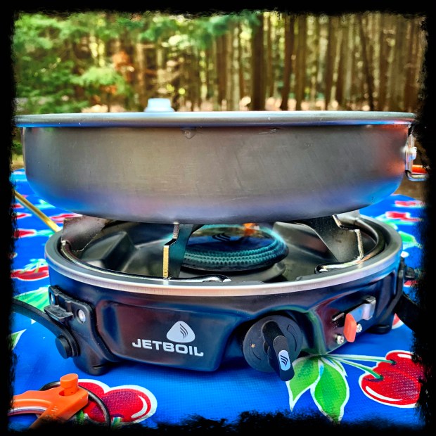 We turned again to researching online and came across the JetBoil HalfGen. It’s a pretty flat one-burner stove that is stable even with large pans on it. It uses regular small camping propane tanks, which are both easier to get and cheaper than the propane/butane mix fuels we used before. And though cooking camping gear may not be the thing you want for your birthday, I was pretty happy to see this among the gifts when we celebrated my birthday and my arm was still cast above my elbow. My camping life was about to get a bit easier.