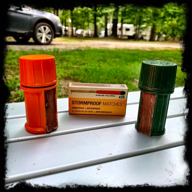 When we went to light the citronella candle on the table the other night, my husband asked why we don’t have a lighter when we camp the way we do at home. I thought about it for a moment before blurting out “because we have camping matches!”.