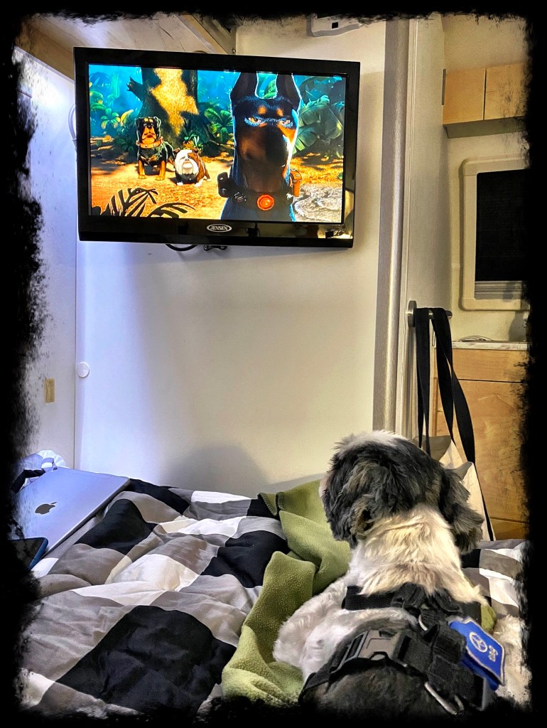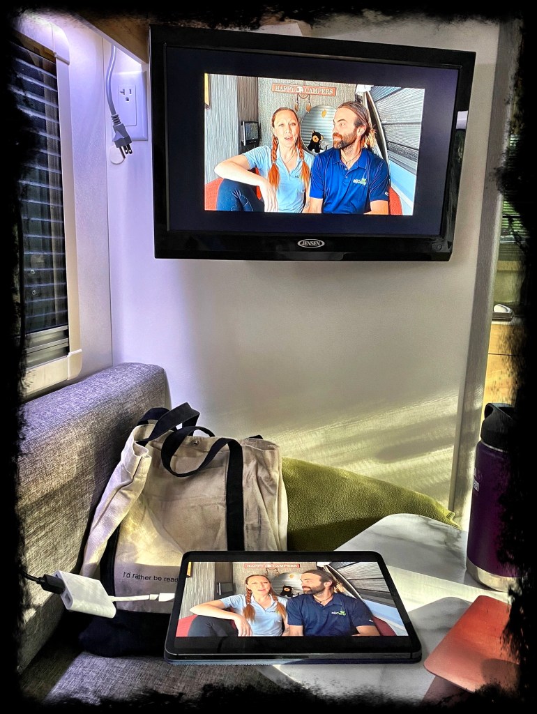 It took a bit of finagling to figure out that the best way to make that happen. We found that the best way is to get some iPad to HDMI converters and an HDMI cable to plug into the media system. Then whatever you are playing on the iPad displays on the TV and the sound comes through the trailer speakers. And at home, since we have the camper close enough to have access to our house wifi network, we are able to stream anything we want to. It’s actually a pretty nice setup!