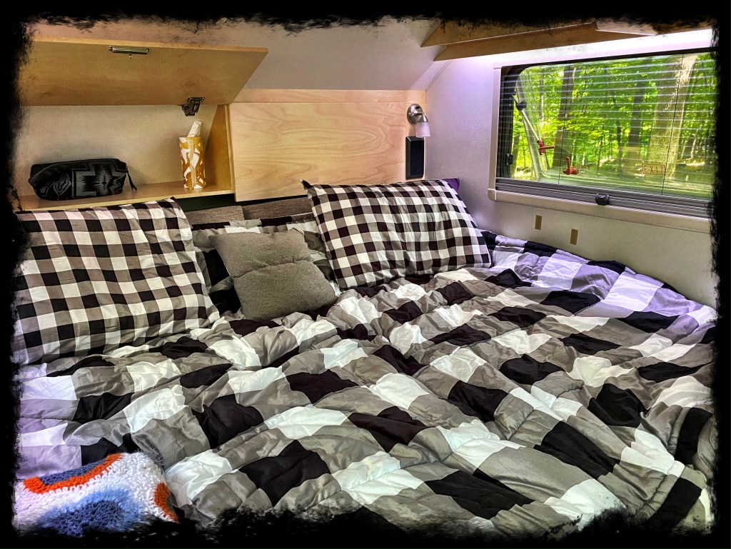 One of the beautiful things about camping in a teardrop is that you are at least off the ground and the bed is enclosed. But in a tiny teardrop like our Silver Shadow, the bed could still be a little too hard, too hot, too damp when it rained and not entirely easy to get in and out of. Over years we worked it out to have new camp mattresses and a thin piece of memory foam and stretchy beech knit sheets where we sewed the bottom of the fitted and flat sheets together so that the bed would be easier to make.