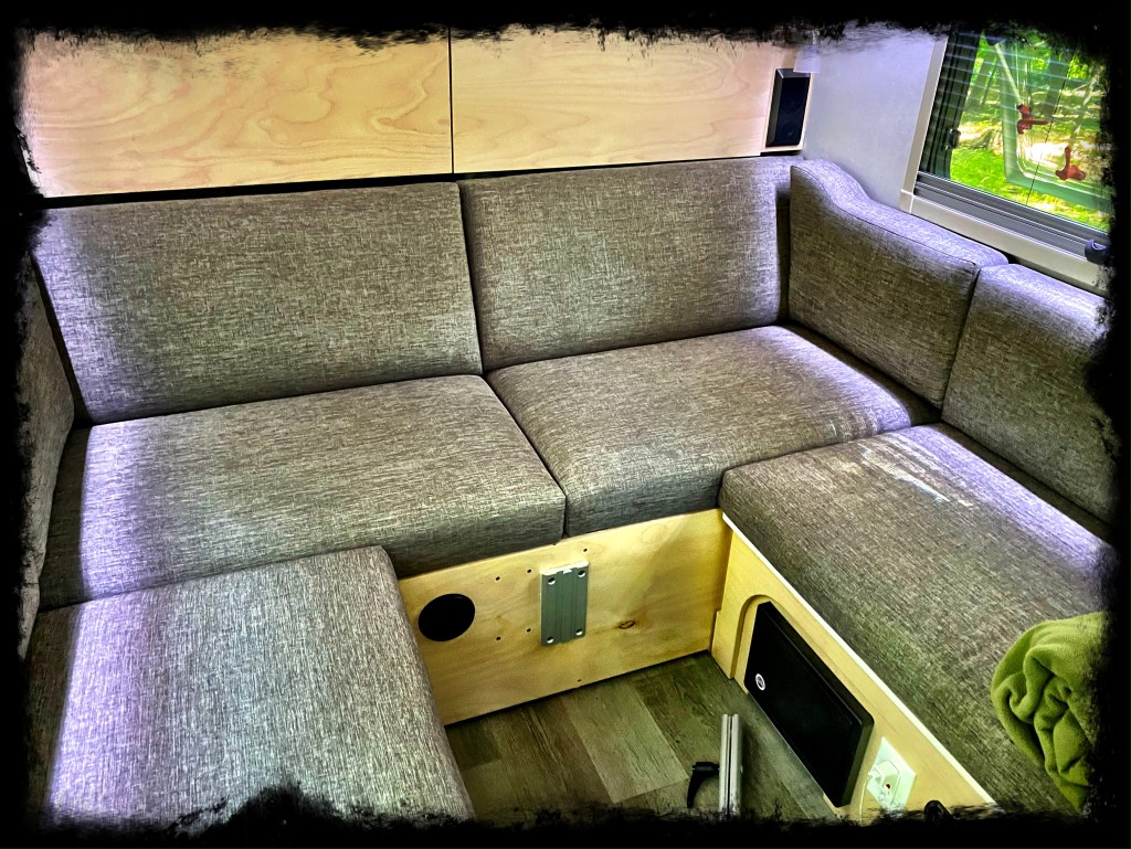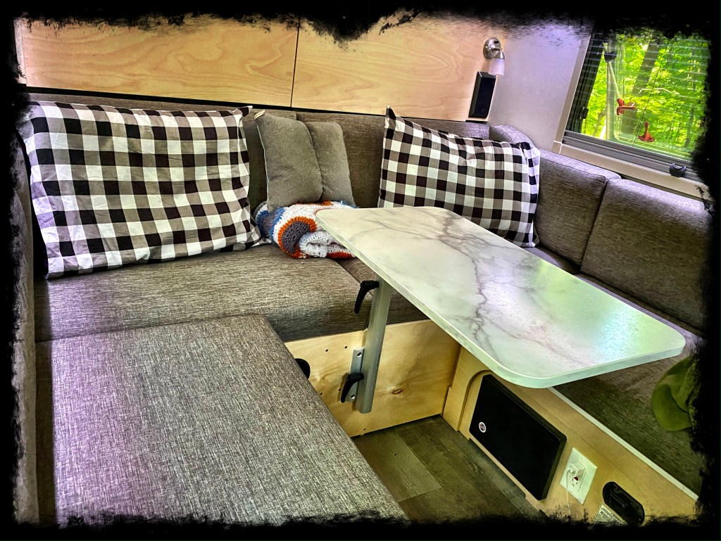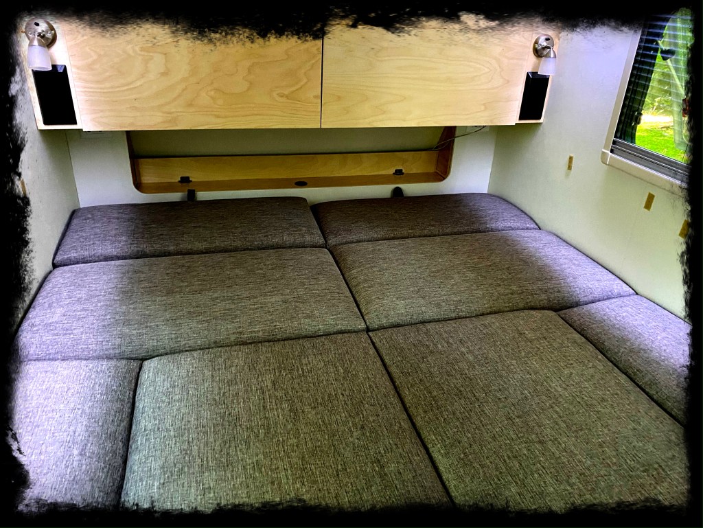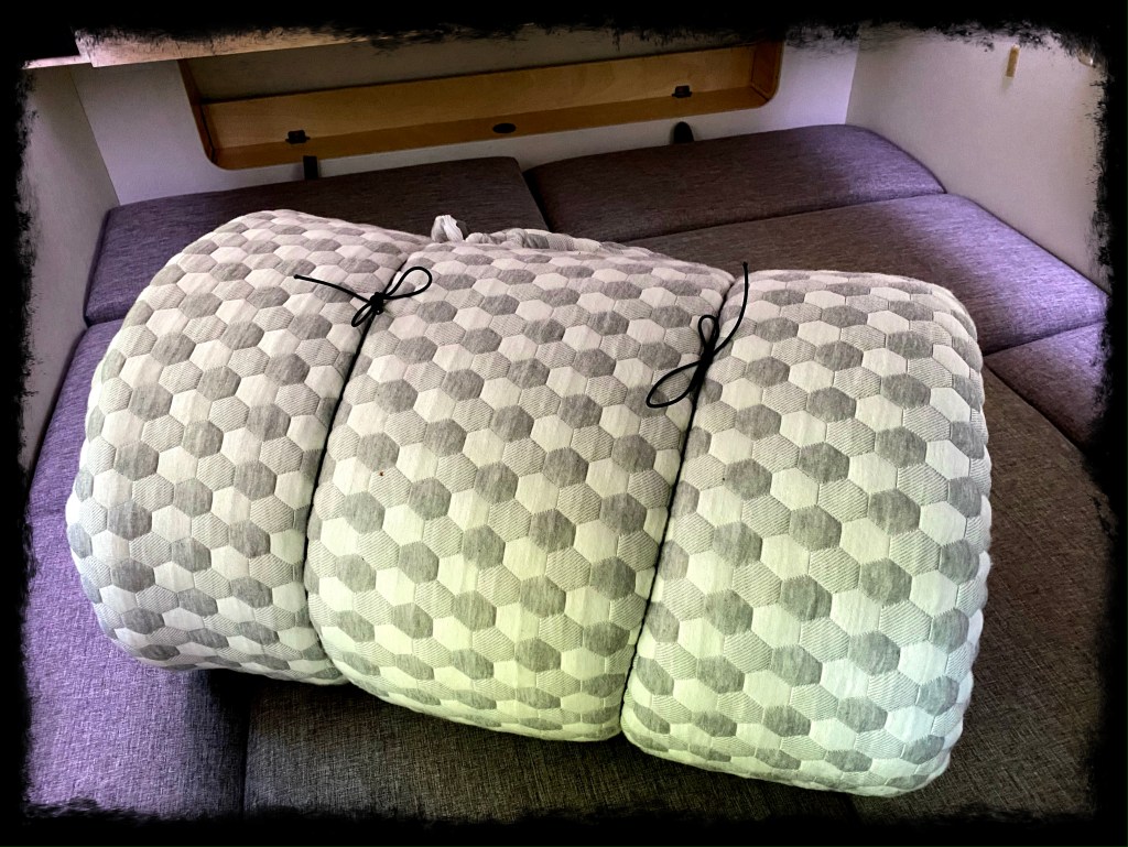 The new T@B comes with its own bedding challenges. We definitely knew that the seat cushions wouldn’t be enough padding for us. The bed itself is both a wide and short Queen size, so not entirely easy to figure out bedding for. We wanted something that would be easy to make and take up so that we could go back and forth between bed/lounge/dinette more easily.