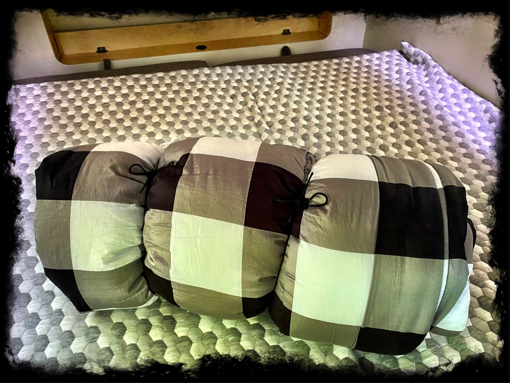 We have found that this combination looks like it is going to work pretty well. We can easily go from dinette to bed in a handful of steps and the bedding pieces can be rolled and strapped to store behind the seatbacks.