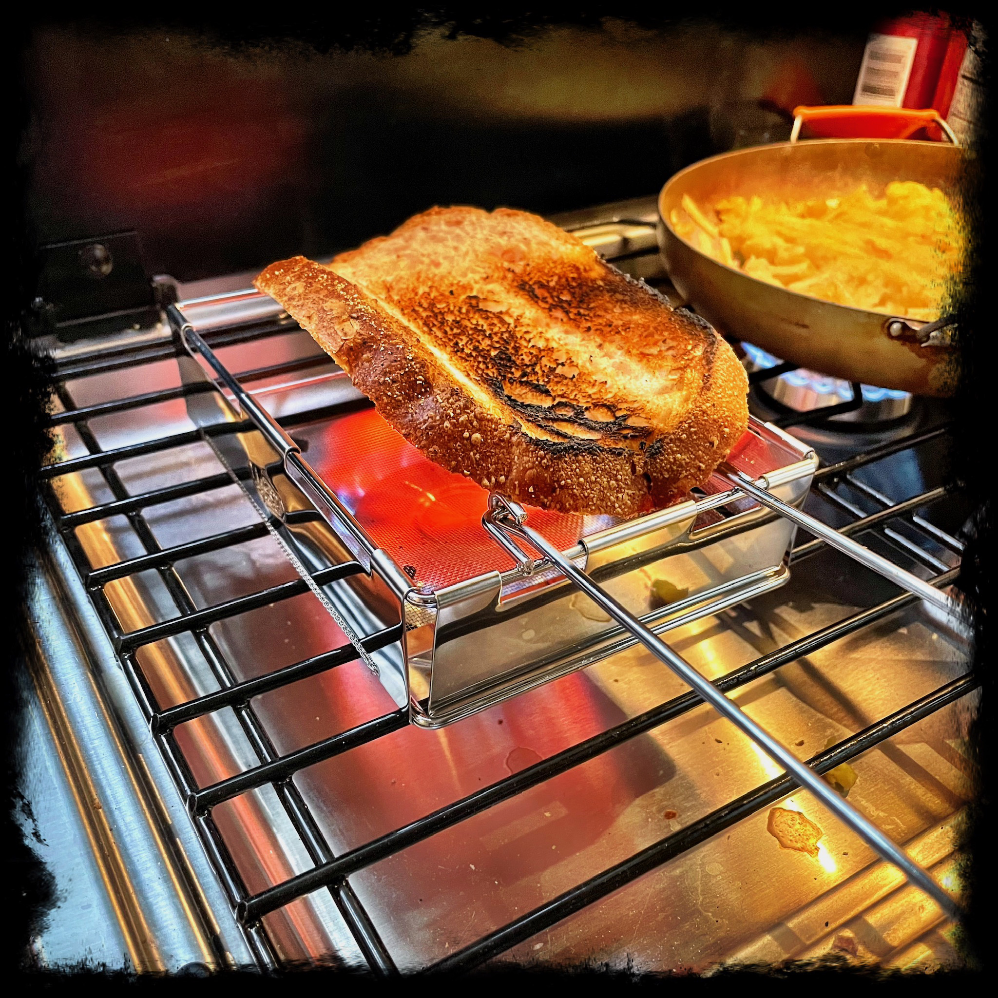This thing is AMAZING!! You just fold it out so that it takes shape, put it on a burner, throw a slice of bread on top and within a minute or so, you are ready to flip it and toast the other side. Just as good as any “real” toaster at home.