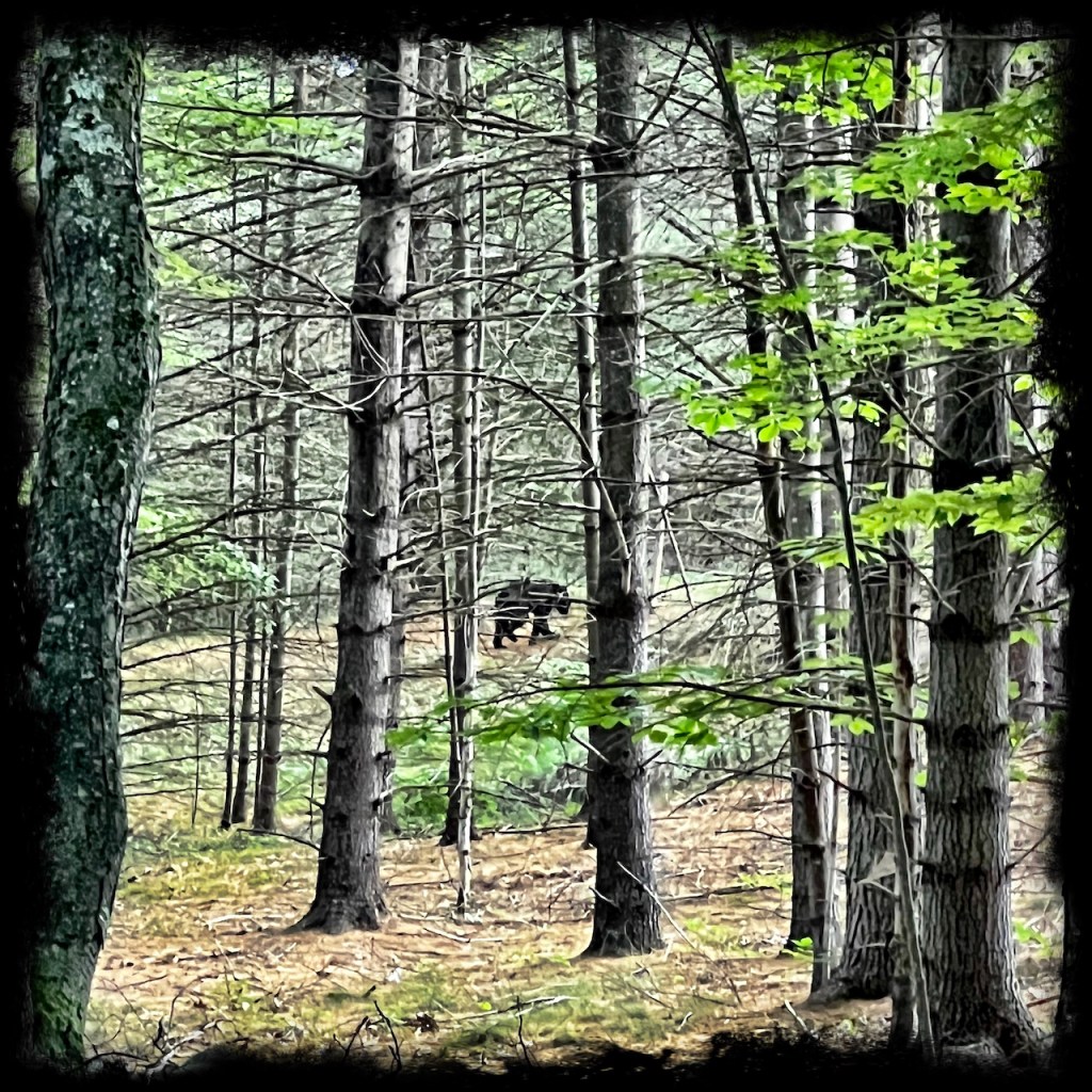 We got to camp in the late afternoon and had everything setup and ready within an hour. I was in the camper bathroom when I heard the dog growling out the camper door and I knew it wasn’t a normal growl. I was frantically pulling up my pants when I opened the bathroom door and could see in the distance a bear headed through the woods and straight toward our camp. He was about 40 yards away when I was calling for Tom to get into the camper with us and the bear saw us looking at him. He turned around and headed back the way he came as Tom backed towards the camper. He was a bit skinny and small, a youngish bear. We were surprised that our shih tzu was such a good watch dog. Ketu (all three of us, really) stayed on watch most of the evening and were exhausted by bedtime.
