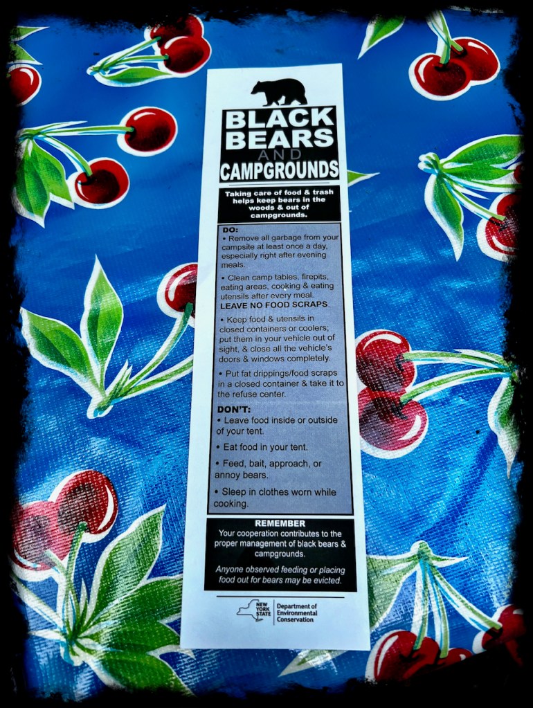 We have always camped in upstate NY where there are frequent bear sightings. Heck, we live downstate where bear sightings may not be as frequent, but happen often enough that you always have a story about one not far away. But we had never actually seen or experienced a bear up close while camping in NY until now.