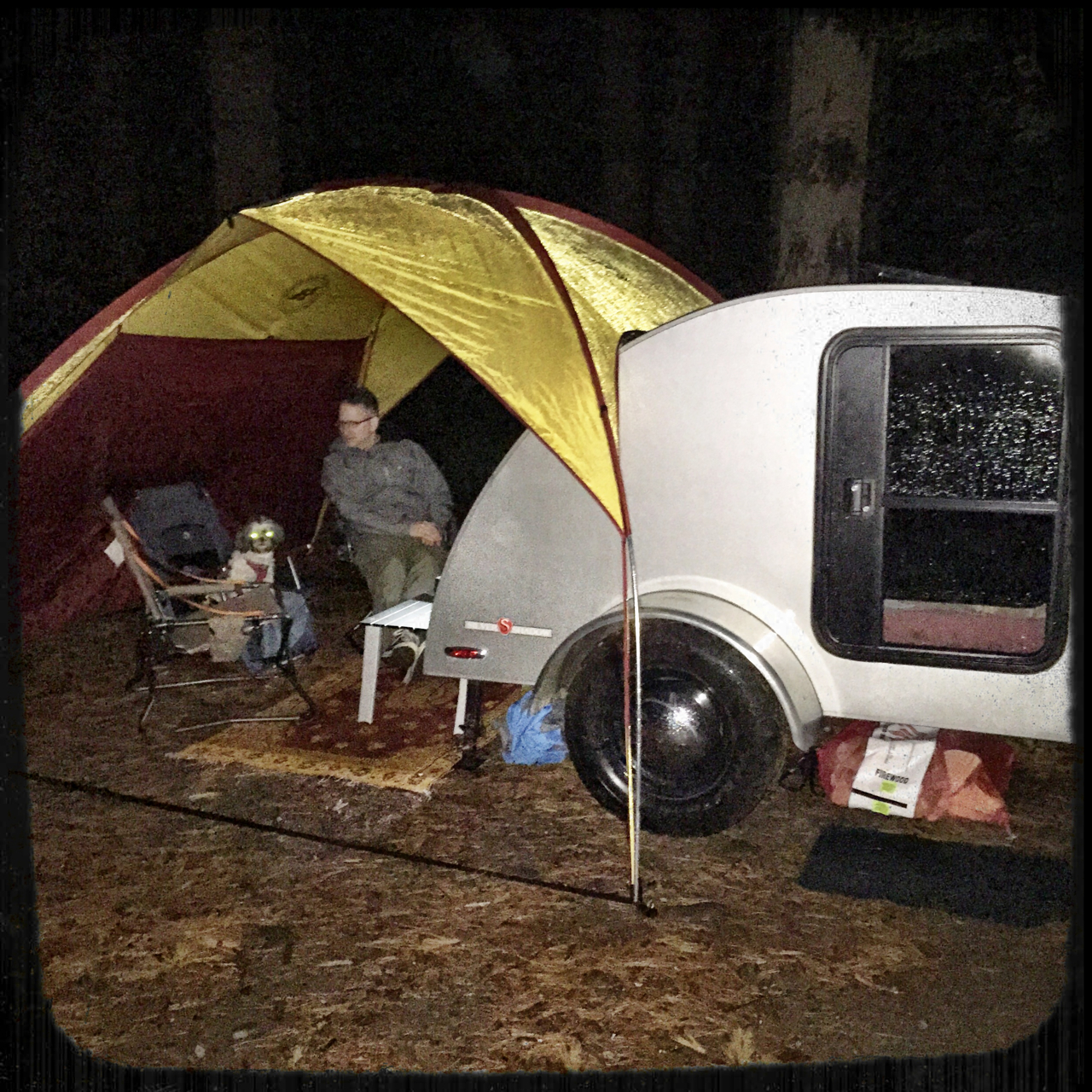 I have to tell you that we are not the super over-cautious rain campers that we have seen with some other teardrop users. I don’t think you’ll ever see us camp with the little sidedoor tents that are meant as changing rooms and to help you get out and put on your rain jacket on in the rain.