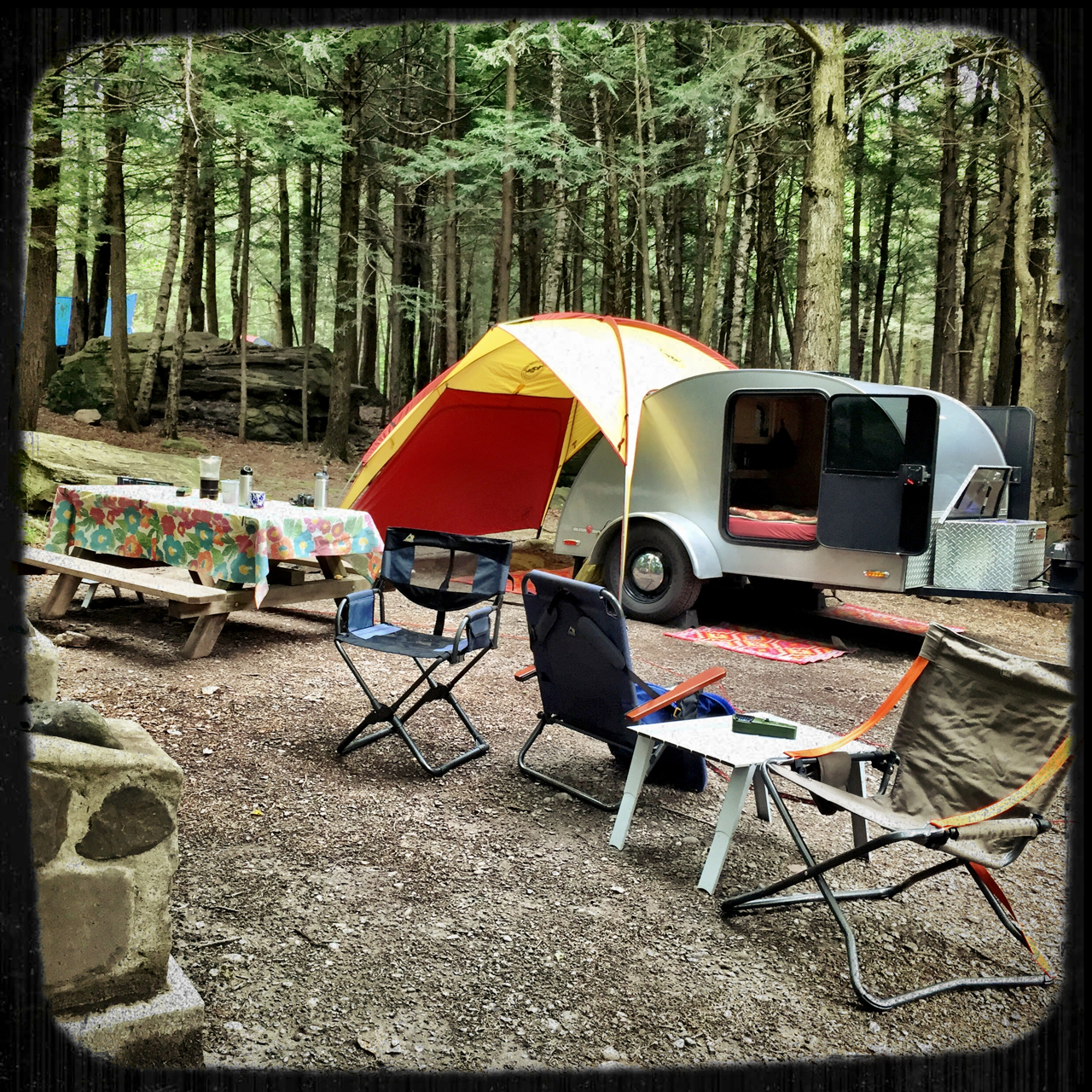 The older 3 legged shelter (ABO Gear Tripod) that we have looks awesome with the teardrop. It’s silver color works really well. But alone, it doesn’t have the shelter area to really keep other equipment dry and it doesn’t have any side walls. It was really meant more as a shade shelter for the beach than a rain shelter for camping. An ideal setup might be to have two Big Agnes shelters, though we haven’t yet made that investment.
