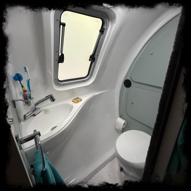 Shower, sink, cassette toilet—the bathroom is just the same, right? Not even close. The bathroom is short, but really efficient. Having those two storage cupboards is great. Having the sink be in front of you when you are sitting on the toilet and not built into a sloped wall behind you is fantastic. The cassette toilet is even easier as it is a little higher and gives you more of a choice of whether and how much water you want to add in. Three things make this bath outstanding: 1- there is heat in the bathroom; 2- you can sit on the toilet, use the basin with washwater and a washcloth and then rinse with the shower; 3- the sliding door makes it easy to leave the bathroom open or closed off. Which is handy to be able to just lean in to wash your hands. And that isn’t even mentioning the frosted window that opens or the ledge that keeps the water in.