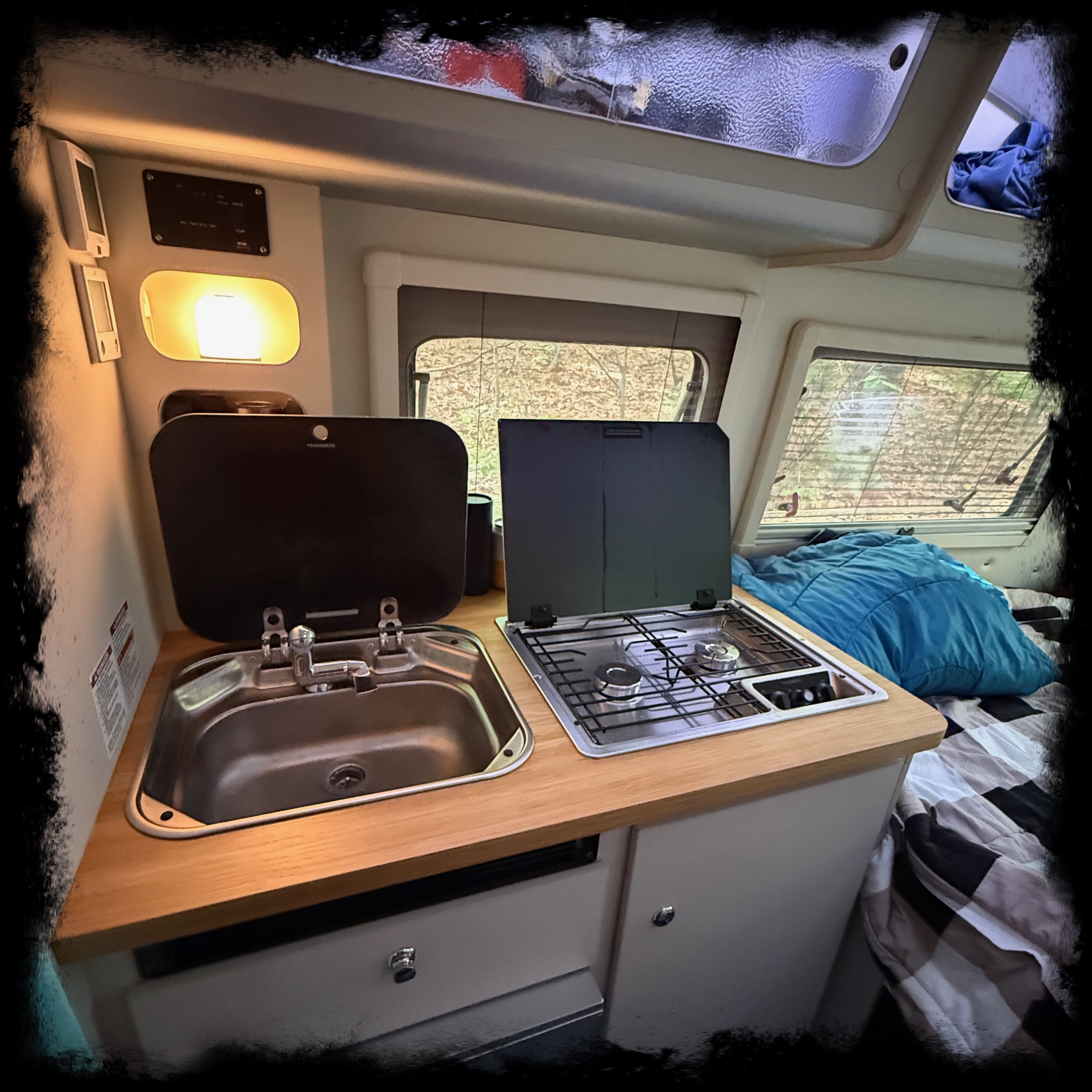 The sink in the Barefoot is lovely and so is the glass cover that makes it easy to use that spot as extra counter space while you cook. Having the counter space across from the sink/stove is also nice It lets one person sit in the bed and do prep while the other cooks. It also makes a great coffee station for our pour-over coffee in the morning. The amount of storage makes it easy to have spots for everything and makes it easy to get what you want. The fridge is good for storage even when you aren’t using it to keep things cool. With a simple washbasin, you can use the sink for washing, the basin for rinsing and two people can work together to get the dishes done in no time. This was always too tight of an operation in the T@B, but is comfortable and easy in the Barefoot. The stove and the fridge are the same ones we had in the T@B and they work great.