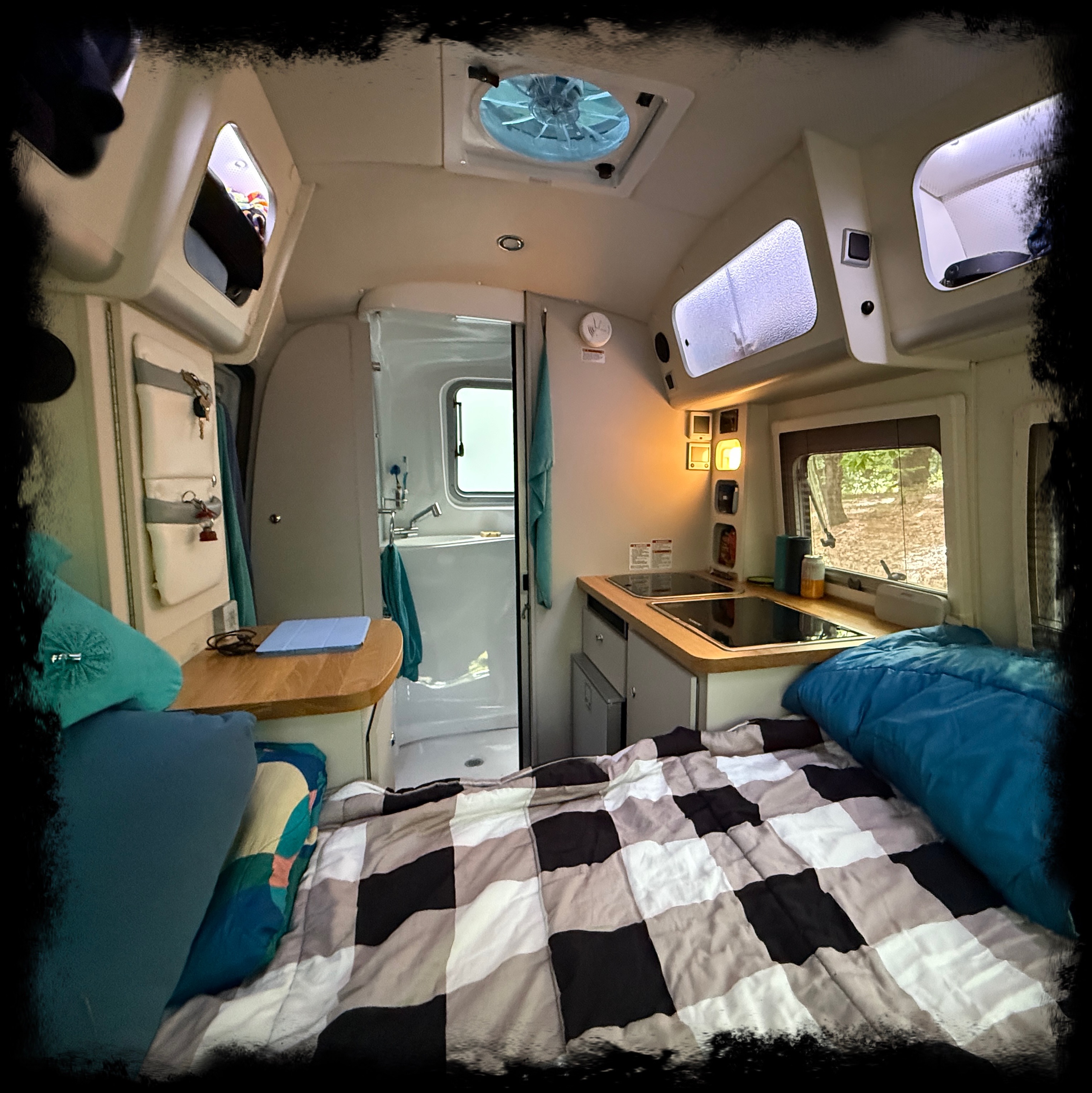 This camper is much easier to stand in for someone tall than the T@B was. But the bath and the bed can be a bit tricky if you are much over 6ft. You are going to have to sit to shower and you are going to have to fold or have your feet hang off to sleep. The bed is wider than a queen size bed, but shorter than a short queen. We like sleeping with our heads under the big window, so we’ve had to adjust to sleeping a bit diagonally to make it work. There is no screen on the door or for the bathroom window. So you need to shut the door to keep out the bugs or jerryrig a screen situation. The light over the door is way too bright to want to use much. We wish it was more dim or kept the bugs away. If things aren’t totally secure in the slidy door cabinet or the kitchen pockets, they will go flying when you are on the road. But we haven’t found more than that not to love!
