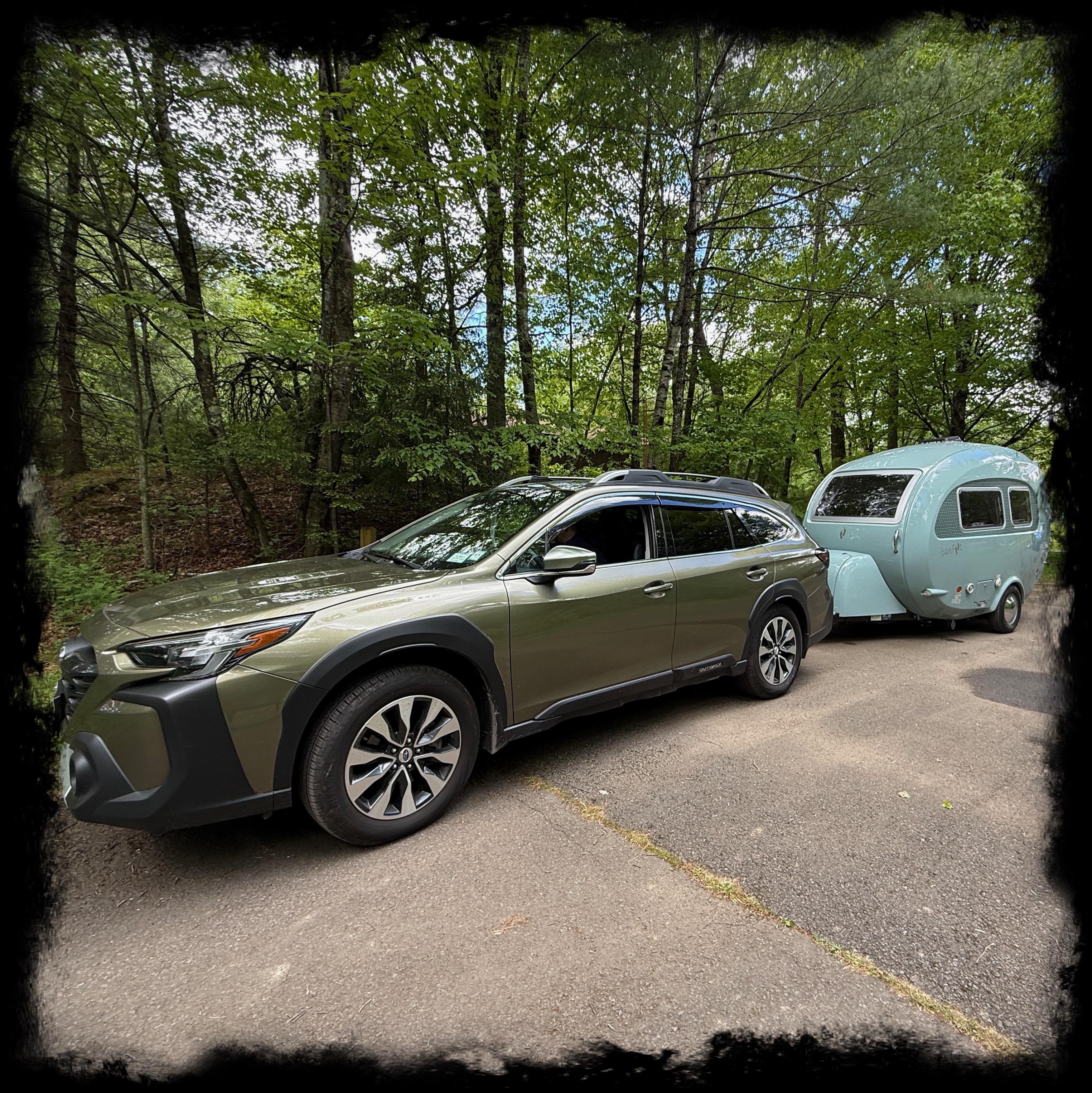 When it came time in 2020 to buy a little bigger camper that had an indoor kitchen and more importantly an indoor bath, we looked at a lot of small trailer options. We looked at larger teardrops—the Little Guy Mini Max, the T@B 320, the RPod. We looked at A-Liners. We also looked at small fiberglass campers like the Scamp and the Happy Camper and the Trillium. We really loved the idea of the Barefoot Caravan, which was a British fiberglass camper that was just starting to partner with nuCamp in the US to make them here. It had such a lovely egg-ish shape and pale teal blue color. And in a lot of ways, it wasn’t unlike the teqrdrops, it just had a slightly different shape, but the same stylish simplicity.