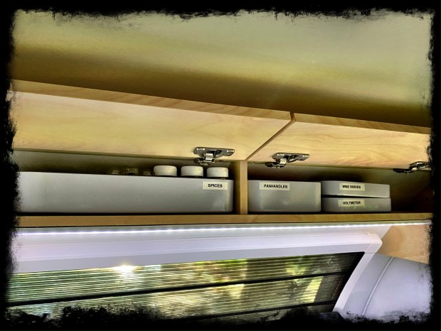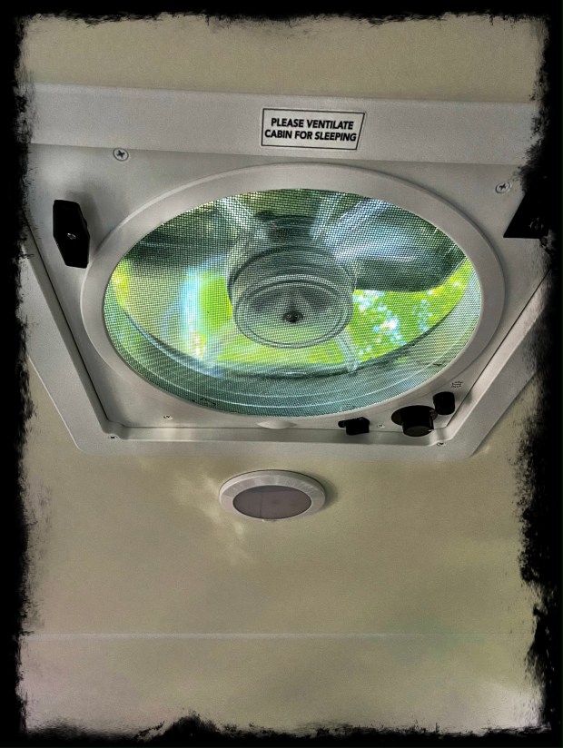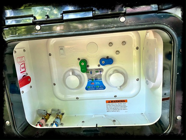 Above the dinette/bed is the entertainment system, the TV and a microwave that works if you have shore power along with some handy storage areas and the controls for the heating system and AC. There is also some storage under a couple of the seats, though most of that space is for the electrical, heat, hot water and AC systems. But there is enough space to store our camp chairs and hammocks and our little folding tables.