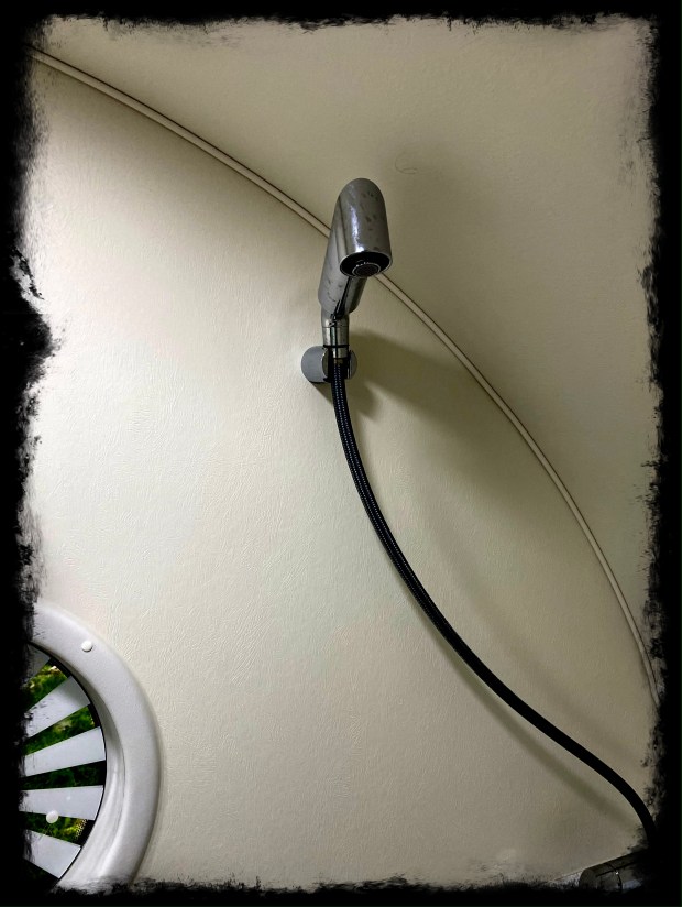 Next to the kitchenette is the wet bath. There is a cassette toilet, a small sink and the handle for that becomes the shower when moved to the wall mounting. It is perfect for being completely self-contained. There is a 19 gallon freshwater tank, an 18 gallon grey water tank and the cassette for the toilet is a 5 gallon tank.