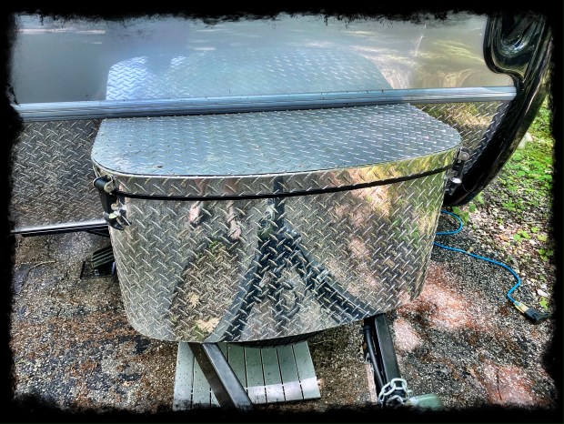 From the front, you can see the new aluminum tongue box. This is where the propane tank and marine battery are stored, but it also has space for your hitching gear and tools, power cables and hose. Also on the front of the trailer you can see the solar panel above the front window. This allows our battery to recharge from the sun while we camp.